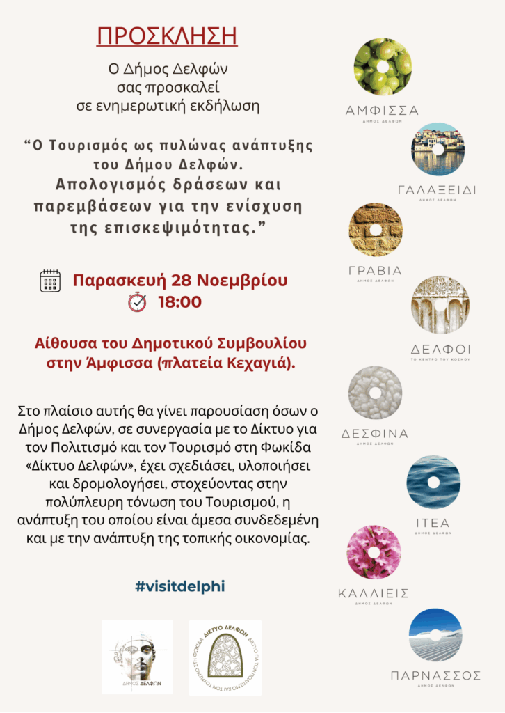 Ενημερωτική εκδήλωση με την παρουσίαση των δράσεων του Δήμου Δελφών για την ανάπτυξη του Τουρισμού, θα πραγματοποιηθεί την Παρασκευή, 28 Νοεμβρίου 2025, στις 18:00, στην αίθουσα του Δημοτικού Συμβουλίου στην Άμφισσα (πλατεία Κεχαγιά).
