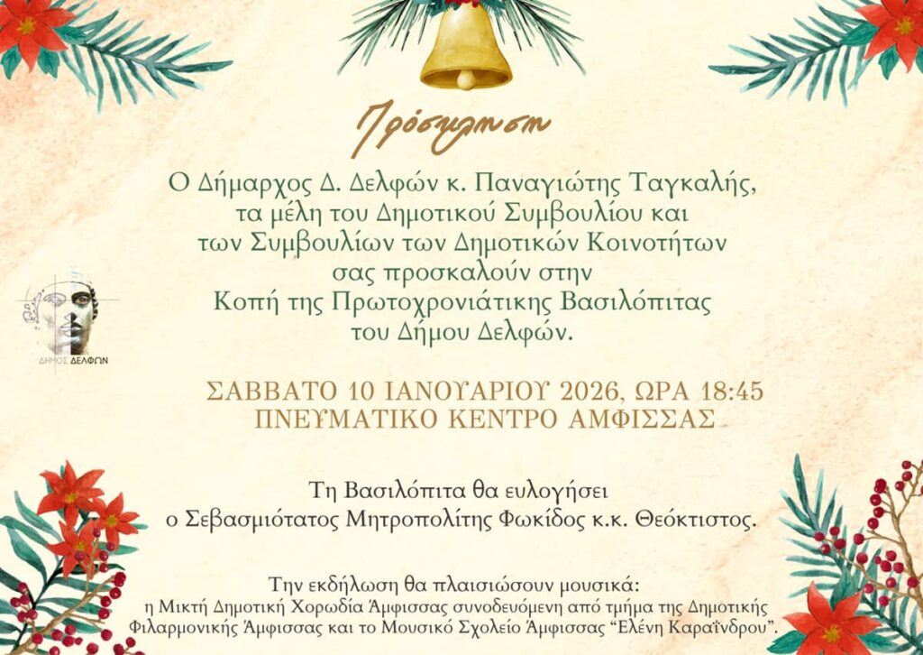 Ο Δήμαρχος Δ. Δελφών κ. Παναγιώτης Ταγκαλής, τα μέλη του Δημοτικού Συμβουλίου και των Συμβουλίων των Δημοτικών Κοινοτήτων προσκαλούν στην Κοπή της Πρωτοχρονιάτικης Βασιλόπιτας του Δήμου Δελφών, η οποία θα πραγματοποιηθεί το Σάββατο 10 Ιανουαρίου 2026, στις 18:45, στο Πνευματικό Κέντρο Άμφισσας.