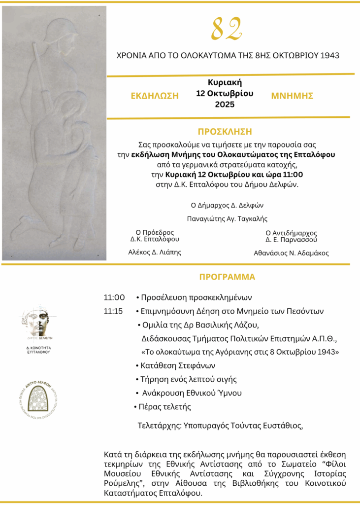 Ο Δήμος Δελφών και η Δημοτική Κοινότητα Επταλόφου προσκαλούν στην εκδήλωση Μνήμης για το Ολοκαύτωμα της Επταλόφου από τα γερμανικά στρατεύματα κατοχής, η οποία θα πραγματοποιηθεί την Κυριακή 12 Οκτωβρίου και ώρα 11:00 στην Δ.Κ. Επταλόφου.