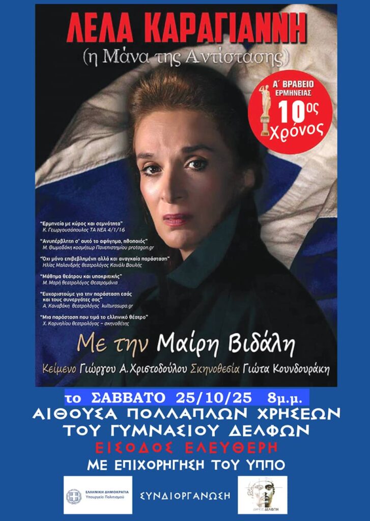 Η θεατρική παράσταση «Λέλα Καραγιάννη (η Μάνα της Αντίστασης)», με τη Μαίρη Βιδάλη, θα ανέβει το Σάββατο 25 Οκτωβρίου, στις 20:00, στην αίθουσα πολλαπλών χρήσεων του Γυμνασίου Δελφών.