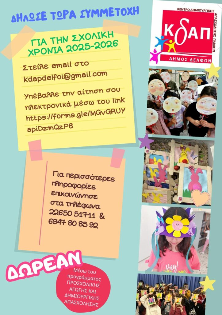 Ο Δήμος Δελφών συνεχίζει το πρόγραμμα των ΚδΑΠ, ενώ για φέτος η επιδίωξη είναι να υπάρξει μεγαλύτερη ΔΩΡΕΑΝ συμμετοχή των παιδιών από όλες τις Δημοτικές μας Ενότητες αφού πλέον λειτουργούν κανονικά και τα 5 ΚδΑΠ στο Δήμο μας: Άμφισσα, Ιτέα, Γαλαξίδι, Δεσφίνα, Πολύδροσο σε αθλητικές, πολιτιστικές δραστηριότητες και με ένα σύνολο υπηρεσιών υψηλού επιπέδου και απαιτήσεων, εντάσσοντας και νέες δράσεις στο καθημερινό πρόγραμμα των παιδιών , όπως Ρομποτική, Πειράματα Φυσικής, Ανακύκλωση και Περιβάλλον, Ρητορική, Κολυμβητήριο (με Δωρεάν μετακίνηση).