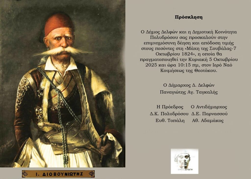 Ο Δήμος Δελφών και η Δημοτική Κοινότητα Πολυδρόσου προσκαλούν στην επιμνημόσυνη δέηση και απόδοση τιμής στους πεσόντες στη «Μάχη της Σουβάλας-7 Οκτωβρίου 1824», η οποία θα πραγματοποιηθεί την Κυριακή 5 Οκτωβρίου 2025 και ώρα 10:15 πμ, στον Ιερό Ναό Κοιμήσεως της Θεοτόκου.