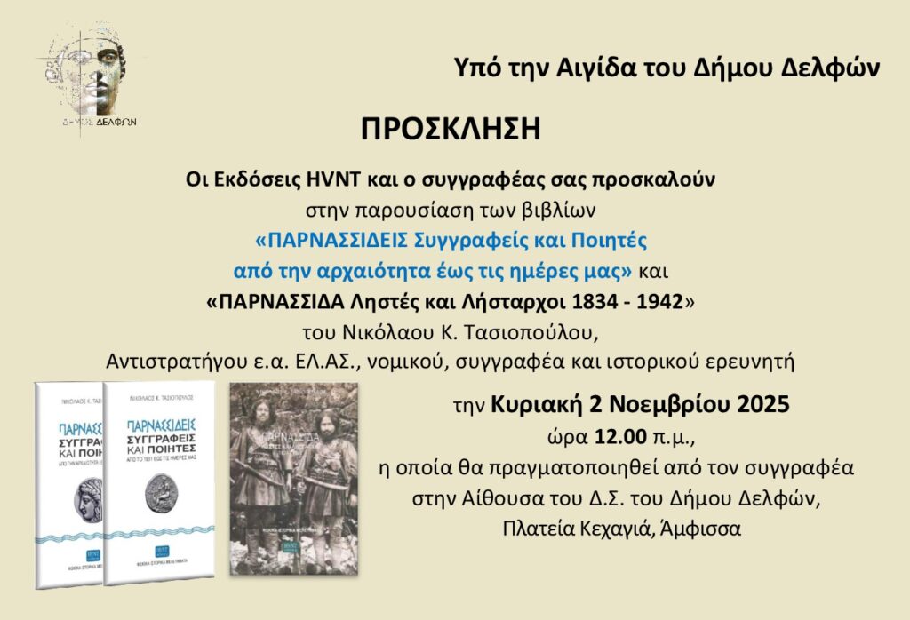 Οι εκδόσεις HVNT και ο συγγραφέας κ. Νικόλαος Κ. Τασιόπουλος προσκαλούν στην παρουσίαση των βιβλίων «ΠΑΡΝΑΣΣΙΔΕΙΣ Συγγραφείς και Ποιητές από την αρχαιότητα έως τις ημέρες μας» και «ΠΑΡΝΑΣΣΙΔΑ Ληστές και Λήσταρχοι 1834-1942».