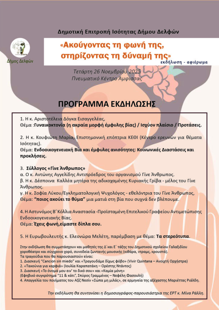 Ο Δήμος Δελφών και η Δημοτική Επιτροπή Ισότητας, με αφορμή την Παγκόσμια Ημέρα για την Εξάλειψη της Βίας κατά των Γυναικών διοργανώνουν την Τετάρτη, 26 Νοεμβρίου 2025, εκδήλωση με θέμα «Ακούγοντας τη φωνή της, στηρίζοντας τη δύναμή της».