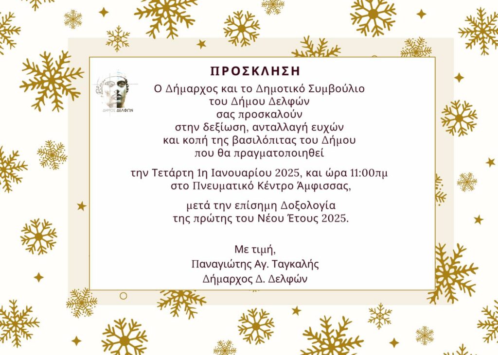 Ο Δήμαρχος Δελφών κ. Παναγιώτης Ταγκαλής και το Δημοτικό Συμβούλιο προσκαλούν στη δεξίωση ανταλλαγής ευχών και κοπής της βασιλόπιτας του Δήμου η οποία θα πραγματοποιηθεί το πρωί της Τετάρτης, 1 Ιανουαρίου 2025, στο Πνευματικό Κέντρο Άμφισσας., με το πέρας της Θείας Λειτουργίας στον Ιερό Μητροπολιτικό Ναό Ευαγγελισμού της Θεοτόκου.