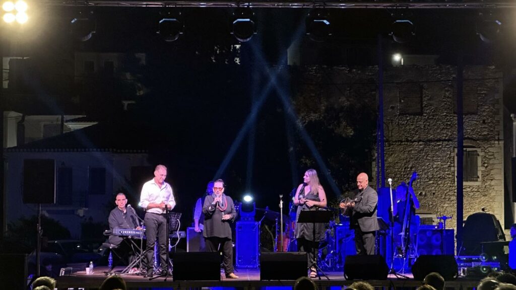 Ο Γεράσιμος Ανδρεάτος, η Ασπασία Στατηγού και ο δεξιοτέχνης του μπουζουκιού Μανώλης Καραντίνης, πλαισιωμένοι από μια ομάδα εξαιρετικών μουσικών, ο Χρήστος Θεοδώρου πιάνο, ο Πέτρος Κρεμυζάκης μπάσο, ο Διονύσης Κοκόλης Τρομπέτα και ο Νίκος Σκομόπουλος ντραμς, χάρισαν ένα ταξίδι γεμάτο ρυθμό, κομψότητα και νοσταλγία. Η Λίνα Νικολακοπούλου, με την καλλιτεχνική της επιμέλεια και την προσωπική της παρουσία, πρόσθεσε στη βραδιά μια ιδιαίτερη αίσθηση τιμής και έμπνευσης. Το κοινό, που γέμισε κάθε γωνιά της πλατείας, παραδόθηκε στον παλμό της μουσικής και στη μαγεία του τοπίου, ζώντας μια εμπειρία που ξεπέρασε τα όρια μιας απλής συναυλίας.