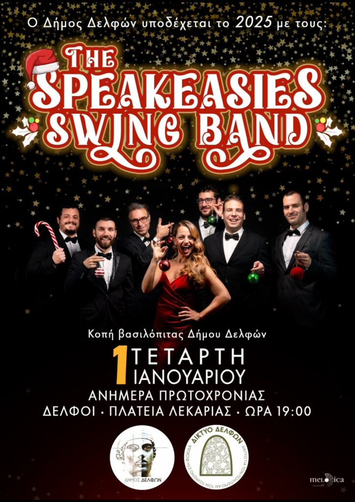 Ο Δήμος Δελφών υποδέχεται το 2025 με τους «The Speakeasies Swing Band» και μία υπέροχη γιορτινή συναυλία η οποία θα πραγματοποιηθεί την Τετάρτη 1 Ιανουαρίου, στις 19:00, στην πλατεία Λεκαριάς στους Δελφούς, στο πλαίσιο της οποίας θα γίνει και η κοπή της βασιλόπιτας για το νέο έτος.