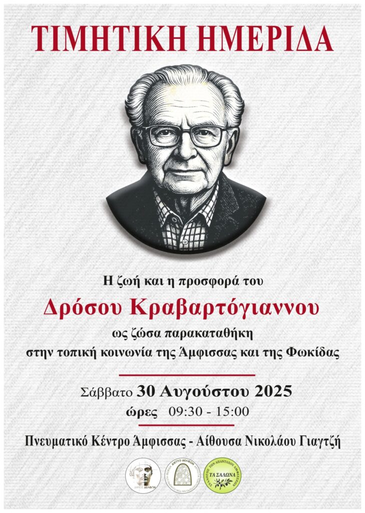 Ο Δήμος Δελφών, το Δίκτυο για τον Πολιτισμό και τον Τουρισμό στη Φωκίδα «Δίκτυο Δελφών» και ο Σύλλογος των Απανταχού Αμφισσέων «Τα Σάλωνα» προσκαλούν στην Τιμητική Ημερίδα, αφιερωμένη στον αείμνηστο Δρόσο Κραβαρτόγιαννο, η οποία θα πραγματοποιηθεί το Σάββατο 30 Αυγούστου 2025, από τις 09:30 έως τις 15:00, στο Πνευματικό Κέντρο Άμφισσας.