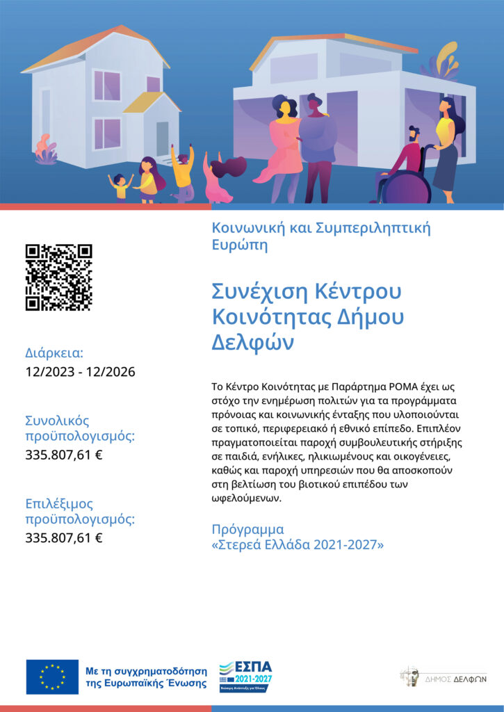 Με την αριθμ. 3643/25-10-2023 (ΑΔΑ:Ψ23Ω7ΛΗ-ΞΒΖ) Απόφαση Περιφερειάρχη Στερεάς Ελλάδας «Ένταξη της Πράξης «Συνέχιση Κέντρου Κοινότητας Δήμου Δελφών» με Κωδικό ΟΠΣ 6002716 και ένταξη στο Πρόγραμμα «ΣΤΕΡΕΑ ΕΛΛΑΔΑ 2021-2027», όπως τροποποιήθηκε και ισχύει με την αριθμ.3729/8.12.2025 Απόφαση Περιφερειάρχη Στερεάς Ελλάδας «Τροποποίηση της Πράξης «Συνέχιση Κέντρου Κοινότητας Δήμου Δελφών» με Κωδικό ΟΠΣ 6002716 στο Πρόγραμμα «ΣΤΕΡΕΑ ΕΛΛΑΔΑ 2021-2027», ρυθμίστηκε η συνέχιση Δράσης του Κέντρου Κοινότητας με Παράρτημα Ρομά Δήμου Δελφών στην προγραμματική περίοδο ΕΣΠΑ 2021 – 2027, με χρηματοδότηση από πόρους του Ευρωπαϊκού Κοινωνικού Ταμείου+ (ΕΚΤ+) του Ε.Π. «ΣΤΕΡΕΑ ΕΛΛΑΔΑ», στο πλαίσιο του Στόχου Πολιτικής 04, συνολικού Προϋπολογισμού 335.807,61 Ευρώ.